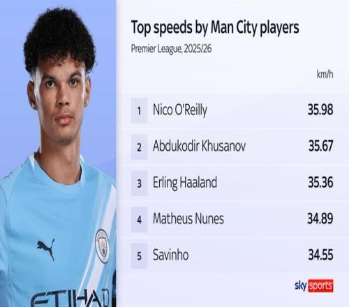 本赛季英超曼城速度榜前五